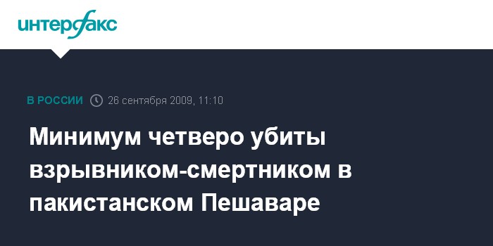 Москва. 26 сентября. INTERFAX.RU - По меньшей мере четыре человека погибли в результате сильного взрыва в городе Пешавар на северо-западе Пакистана, передает британская телерадиокорпорация Би-би-си. По ее данным, причиной трагедии стало нападение боевика-смертника.