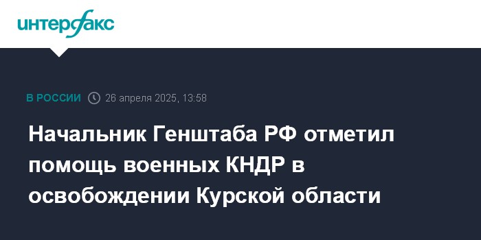 Москва. 26 апреля. INTERFAX.RU - Военнослужащие КНДР оказали значительную помощь в освобождении Курской области от подразделений ВСУ, заявил начальник генерального штаба Вооруженных сил РФ Валерий Герасимов.