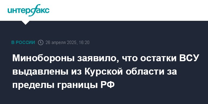 Москва. 26 апреля. INTERFAX.RU - Российские военные заявили, что завершен разгром подразделений ВСУ на территории Курской области, украинские силы выдавлены за пределы госграницы.