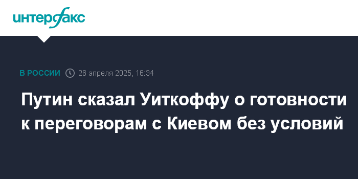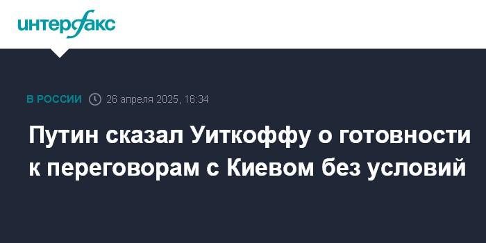 Москва. 26 апреля. INTERFAX.RU - Президент РФ Владимир Путин на встрече со спецпосланником президента США Стивеном Уиткоффом подтвердил готовность российской стороны к переговорам с Украиной без предварительных условий, сообщил журналистам пресс-секретарь российского лидера Дмитрий Песков в субботу.