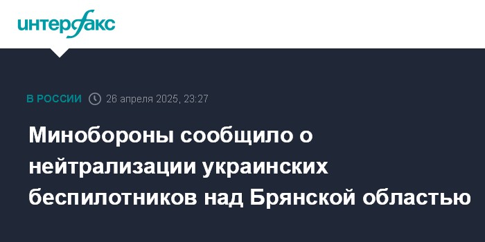 Москва. 26 апреля. INTERFAX.RU - Российские военные нейтрализовали три беспилотника ВСУ над Брянской областью, заявили в Минобороны РФ.