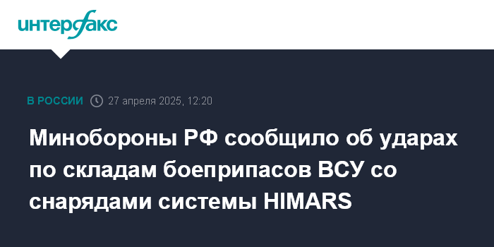 Москва. 27 апреля. INTERFAX.RU - Российские военные сообщили, что нанесли удары по складам боеприпасов ВСУ, в том числе со снарядами реактивной системы залпового огня HIMARS.
