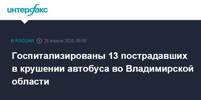 Москва. 28 апреля. INTERFAX.RU - Госпитализированы 13 пострадавших в результате ДТП с автобусом во Владимирской области, один пациент - в тяжелом состоянии, сообщает телеграм-канал федерального Минздрава.