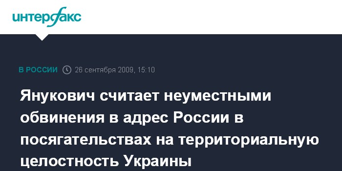 Москва. 26 сентября. INTERFAX.RU - Лидер Партии регионов Виктор Янукович считает неуважением обвинения со стороны украинской власти в адрес России о якобы посягательствах Москвы на территориальную целостность Украины.