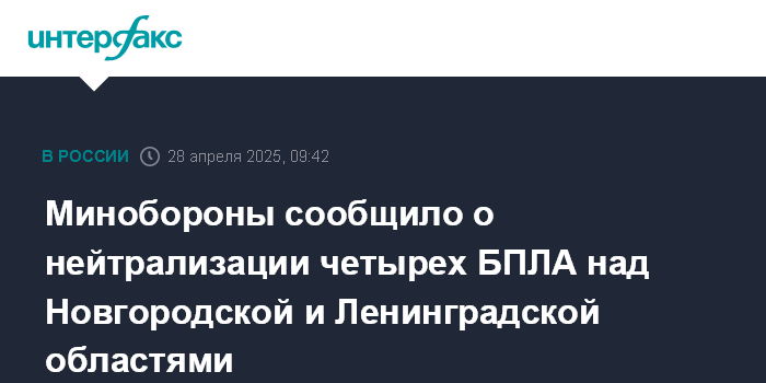 Москва. 28 апреля. INTERFAX.RU - Дежурные средства ПВО перехватили и уничтожили четыре украинских беспилотных летательных аппарата самолетного типа: два БПЛА - над территорией Новгородской области и два БПЛА - над территорией Ленинградской области, сообщает Министерство обороны.