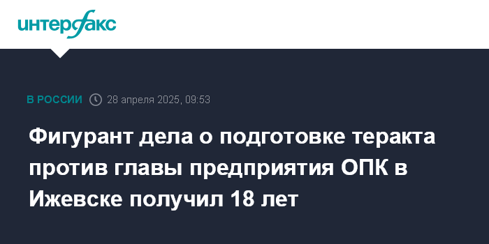 Москва. 28 апреля. INTERFAX.RU - Центральный окружной военный суд приговорил к 18 годам колонии гражданина России 1990 года рождения, участника запрещенной в России террористической организации, по делу о подготовке теракта против руководителя одного из расположенных в Ижевске предприятий оборонно-промышленного комплекса, сообщили в ЦОС ФСБ.