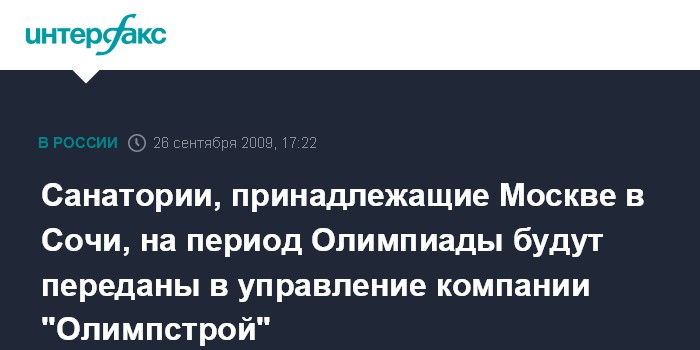 Москва. 26 сентября. INTERFAX.RU - На время Зимней Олимпиады-2014 два санатория, принадлежащие Москве и находящиеся в Сочи, будут переданы в управление компании "Олимпстрой", сообщил "Интерфаксу" заместитель мэра, руководитель комплекса имущественно-земельных отношений Москвы Владимир Силкин.