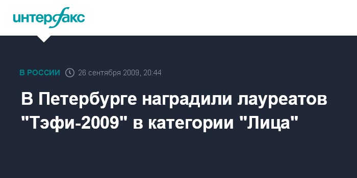Санкт-Петербург. 26 сентября. ИНТЕРФАКС СЕВЕРО-ЗАПАД - В Михайловском театре Петербурга в субботу бронзовые статуэтки "Орфеев" вручили лауреатам национального телевизионного конкурса "ТЭФИ 2009" в категории "Лица", передал корреспондент "Интерфакса".
