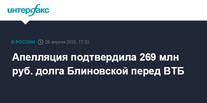 Апелляция подтвердила 269 млн руб. долга Блиновской перед ВТБ