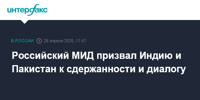 Москва. 28 апреля. INTERFAX.RU - Россия в связи с эскалацией напряжённости между Индией и Пакистаном призывает обе стороны к сдержанности и диалогу, заявили в МИД РФ.