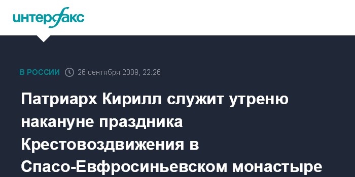 Полоцк (Белоруссия). 26 сентября. ИНТЕРФАКС - Патриарх Московский и всея Руси Кирилл вечером в субботу, накануне праздника Воздвижения Креста Господня, совершает утреню в Спасо-Евфросиньевском женском монастыре Полоцка.