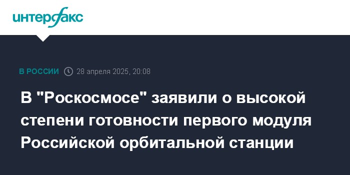Москва. 28 апреля. INTERFAX.RU - Первый модуль Российской орбитальной станции, которая придёт на смену Международной космической станции, находится в высокой степени готовности, сообщил гендиректор "Роскосмоса" Дмитрий Баканов.