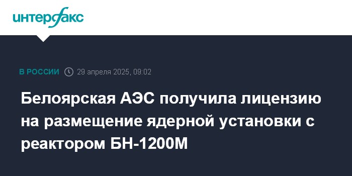 Москва. 29 апреля. INTERFAX.RU - Ростехнадзор выдал Белоярской АЭС (Свердловская область) лицензию на размещение ядерной установки блока с реактором IV поколения БН-1200М, сообщается в телеграм-канале станции.