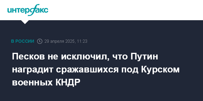 Москва. 29 апреля. INTERFAX.RU - Президент РФ Владимир Путин, возможно, наградит военнослужащих из КНДР, сражавшихся в Курской области, допустил пресс-секретарь главы российского государства Дмитрий Песков.