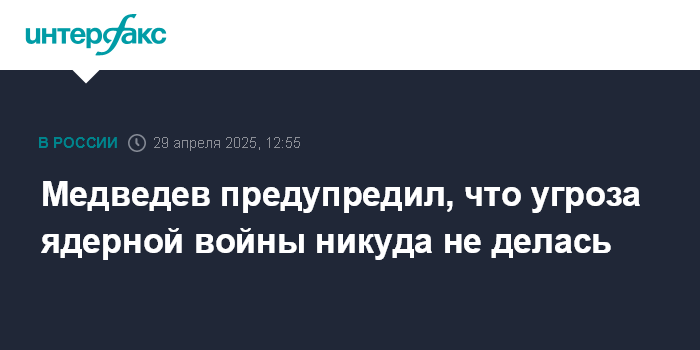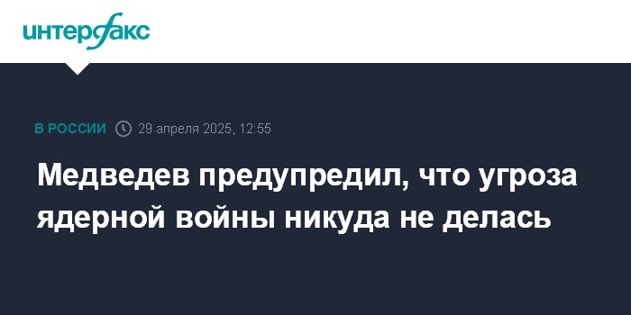Москва. 29 апреля. INTERFAX.RU - Напряжение, связанное с угрозой новой ядерной войны в мире, снизилось, но оно по-прежнему существует, заявил замглавы Совбеза РФ Дмитрий Медведев.