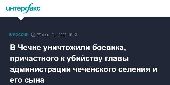 Москва. 27 сентября. INTERFAX.RU - В Чечне в воскресенье уничтожен один из боевиков, причастных к совершенному в субботу вечером убийству главы администрации населенного пункта Старый Ачхой Али Артамова и его сына Анзора, сообщили "Интерфаксу" в администрации Ачхой-Мартановского района.