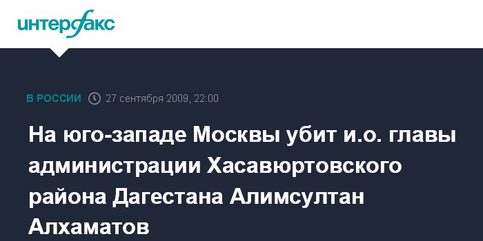 Москва. 27 сентября. ИНТЕРФАКС - МОСКВА - В результате расстрела на Новочеремушкинской улице был убит и.о. главы администрации Хасавюртовского района Дагестана Алимсултан Алхаматов.