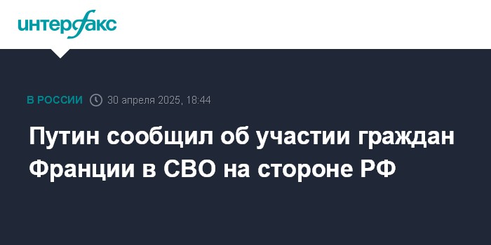 Москва. 30 апреля. INTERFAX.RU - Президент РФ Владимир Путин сообщил, что в зоне СВО есть французские граждане, воюющие на стороне России.