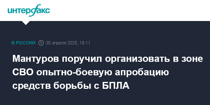 Москва. 30 апреля. INTERFAX.RU - Первый вице-премьер России Денис Мантуров распорядился осуществить в зоне проведения специальной военной операции опытно-боевую апробацию новейших систем и комплексов борьбы с беспилотными летательными аппаратами.
