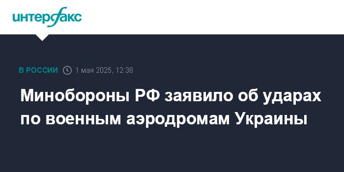 Москва. 1 мая. INTERFAX.RU - Российские военные сообщили, что в течение суток нанесли удары по военным аэродромам Украины, складам боеприпасов, цехам производства беспилотников.