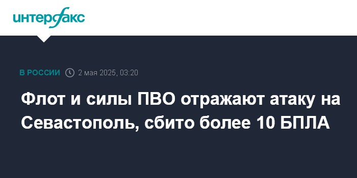 Москва. 2 мая. INTERFAX.RU - Массированную атаку на Севастополь отражают система ПВО и флот, над морем уничтожено более 10 беспилотников, сообщил губернатор Михаил Развожаев.