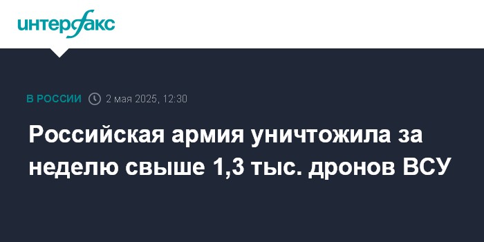 Москва. 2 мая. INTERFAX.RU - Более 1,3 тыс. украинских беспилотников уничтожено российскими военными за неделю, сообщило Минобороны РФ в пятницу.