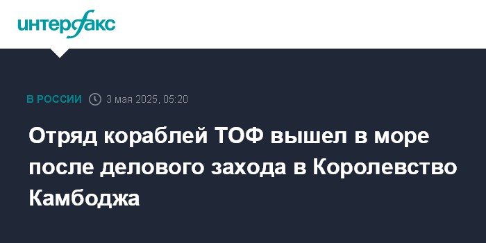 Москва. 3 мая. INTERFAX.RU - Отряд кораблей Тихоокеанского флота (ТОФ) в составе корветов "Резкий", "Герой Российской Федерации Алдар Цыденжапов" и среднего морского танкера "Печенга" завершил программу пребывания в Королевстве Камбоджа, сообщает пресс-служба Тихоокеанского флота.