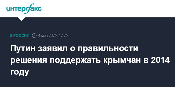 Москва. 4 мая. INTERFAX.RU - Президент РФ Владимир Путин считает, что поддержка в 2014 году крымчан была правильным решением, несмотря на западные санкции против России.