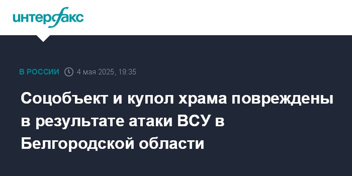 Москва. 4 мая. INTERFAX.RU - Губернатор Белгородской области Вячеслав Гладков сообщил об атаках украинских дронов на регион, в результате которых повреждён купол храма Благовещения Пресвятой Богородицы в селе Ясные Зори, а также социальный объект в Шебекинском округе, никто не пострадал.