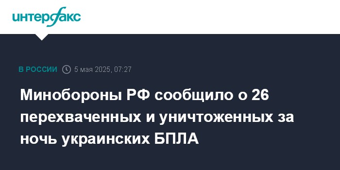 "За период с 23.00 мск 4 мая до 02.30 мск 5 мая дежурными средствами ПВО перехвачены и уничтожены 26 украинских беспилотных летательных аппаратов самолетного типа: 17 БПЛА - над территорией Брянской области, пять БПЛА - над территорией Калужской области, четыре БПЛА - над территорией Московского региона", - говорится в сообщении.