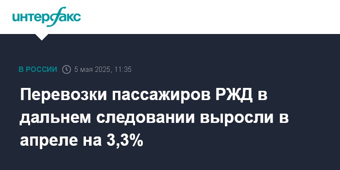 Москва. 5 мая. INTERFAX.RU - Перевозки пассажиров по сети ОАО "РЖД" в дальнем следовании выросли в апреле 2025 г. на 3,3% по сравнению с апрелем прошлого года, до 9,5 млн человек, сообщила компания.
