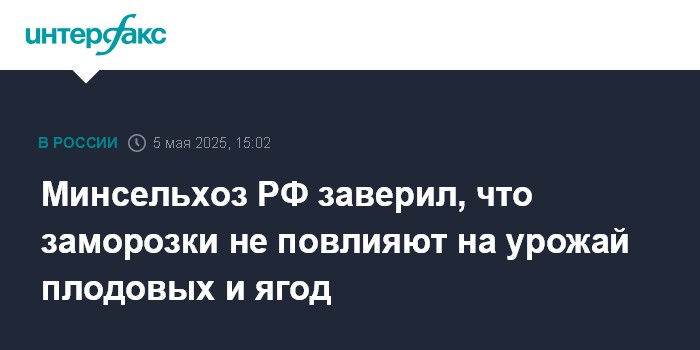 Москва. 5 мая. INTERFAX.RU - В России в 2025 году планируется собрать порядка 2,1 млн тонн плодовых и ягод, две волны весенних заморозков на урожай не повлияют, сообщила глава Минсельхоза Оксана Лут.