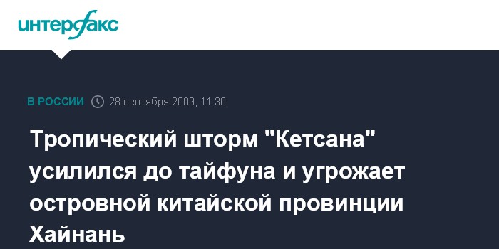 Москва. 28 сентября. INTERFAX.RU – Метеорологическое управление китайской южной островной провинции Хайнань срочно распространило в понедельник в полдень штормовое предупреждение, сообщили местные СМИ.
