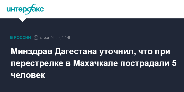 Москва. 5 мая. INTERFAX.RU - По последним данным Минздрава Дагестана, при перестрелке в Махачкале ранения получили пять человек, в том числе трое гражданских лиц.