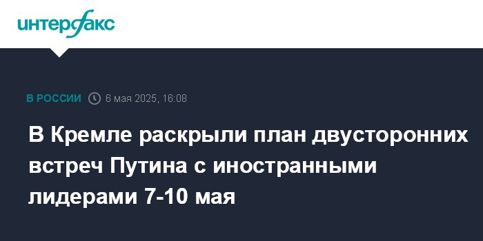 8 мая президент России проведет встречу с председателем КНР Си Цзиньпином. 9 мая Путин планирует переговоры с премьер-министром Словакии Робертом Фицо, президентом Сербии Александром Вучичем, а также с президентом Бразилии Луисом Инасиу Лулой да Силвой.
