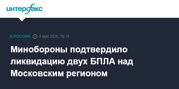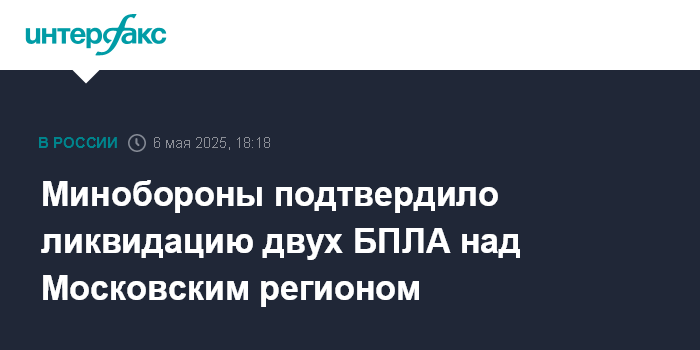 Москва. 6 мая. INTERFAX.RU - Два украинских беспилотника самолетного типа уничтожены над Московским регионом во вторник с 16:40 до 17:20 дежурными средствами ПВО, сообщило Минобороны России.
