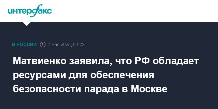 Москва. 7 мая. INTERFAX.RU - Россия имеет все необходимые ресурсы для обеспечения безопасности гостей парада Победы в Москве 9 мая и предотвращения провокаций, заявила спикер Совета Федерации Валентина Матвиенко.
