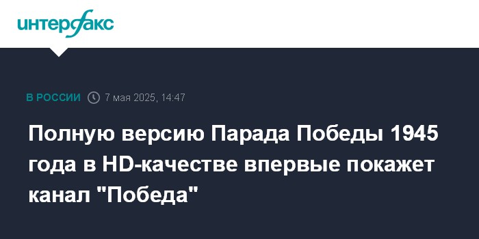 "9 мая в 19:00 по московскому времени зрители телеканала "Победа" (входит в "Цифровое Телесемейство") впервые увидят полную версию исторического Парада Победы 1945 года в HD-качестве. Полная хроника того дня - от утреннего движения колонн военных к Красной площади до вечернего салюта", - сообщили "Интерфаксу" в пресс-службе канала в среду.