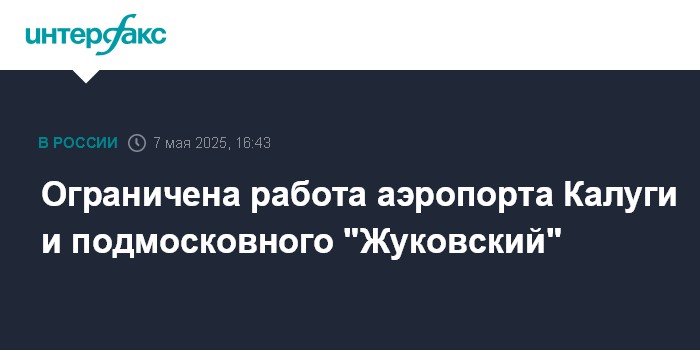 Москва. 7 мая. INTERFAX.RU - Введены временные ограничения в работе аэропортов "Жуковский" (Раменское) и "Калуга" (Грабцево), сообщил представитель Росавиации Артем Кореняко.