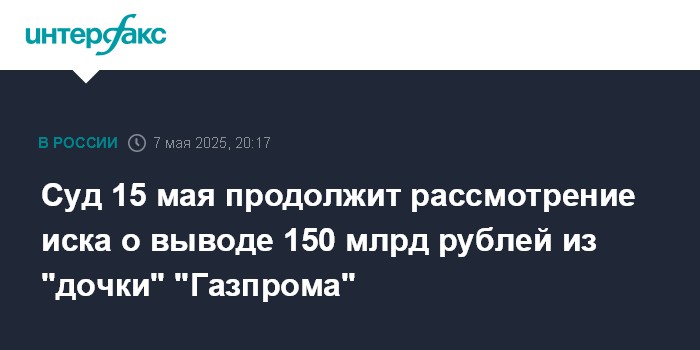 Суд 15 мая продолжит рассмотрение иска о выводе 150 млрд рублей из "дочки" "Газпрома"