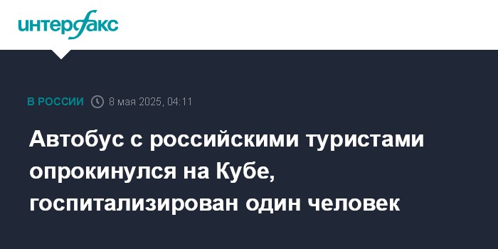 "Посольство и Генеральное консульство в Гаване в курсе ДТП с участием автобуса с российскими туристами, произошедшего 6 мая в районе г. Хагуэй-Гранде (провинция Матансас), в результате которого госпитализирован 1 человек", - отмечается в телеграм-канале посольства.