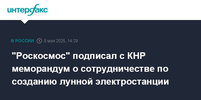 Москва. 8 мая. INTERFAX.RU - "Роскосмос" и Китайская национальная космическая администрация подписали меморандум о сотрудничестве по созданию лунной электростанции, сообщила госкорпорация в четверг.