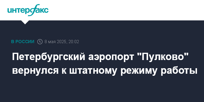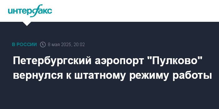 Москва. 8 мая. INTERFAX.RU - "Пулково" вернулся к штатному режиму работы, говорится в телеграм-канале ООО "Воздушные ворота Северной столицы" (ВВСС, оператор петербургского аэропорта "Пулково").