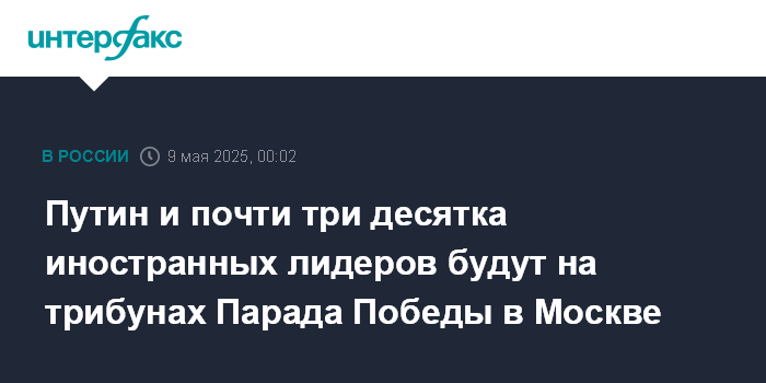 Москва. 9 мая. INTERFAX.RU - Президент России Владимир Путин и почти три десятка иностранных лидеров 9 мая примут участие в торжественных мероприятиях, посвященных 80-летию Победы в Великой Отечественной войне.