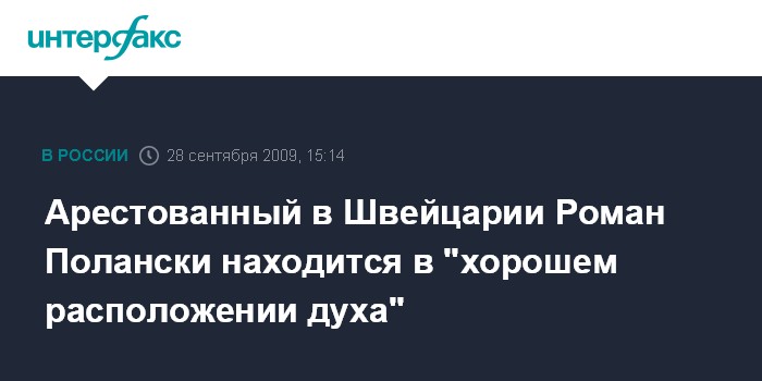 Москва. 28 сентября. INTERFAX.RU - Известный кинорежиссер Роман Полански, арестованный в субботу в Швейцарии, находится в "хорошем расположении духа", сообщает газета "Дейли телеграф" со ссылкой на заявление агента режиссера Джеффа Берга. "Он в хорошем расположении духа, его голос крепок, он очень хочет, чтобы все это разрешилось, и он смог поехать домой", - заявил Берг.