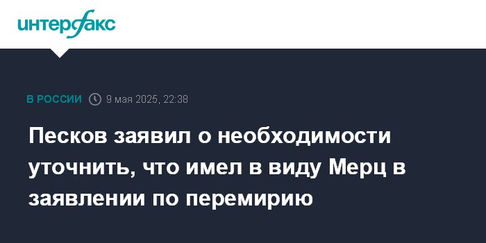 Москва. 9 мая. INTERFAX.RU - Пресс-секретарь президента РФ Дмитрий Песков заявил о необходимости выяснить, что имел в виду канцлер ФРГ Фридрих Мерц, говоря о том, что в ближайшие выходные может быть достигнута договоренность о тридцатидневном перемирии на Украине.