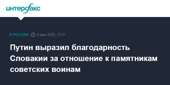 Москва. 9 мая. INTERFAX.RU - Президент РФ Владимир Путин поблагодарил руководство Словакии в лице премьер-министра этой страны Роберта Фицо за внимательное и бережное отношение к памятникам и захоронениям советских воинов.