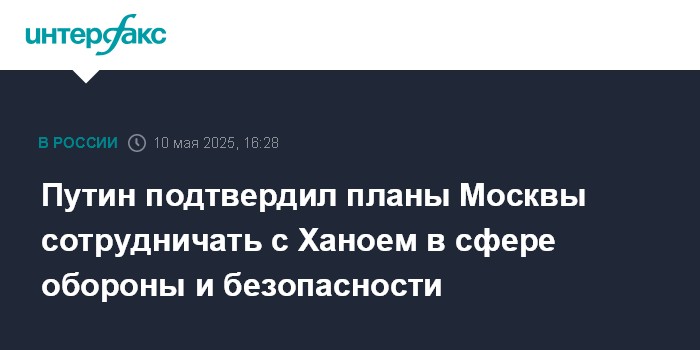Москва. 10 мая. INTERFAX.RU - Президент РФ Владимир Путин подтвердил планы Москвы и Ханоя развивать сотрудничество в сфере обороны и безопасности.