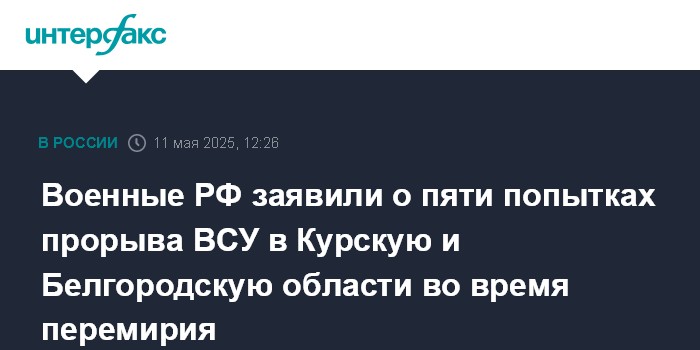 Москва. 11 мая. INTERFAX.RU - Вооруженные силы Украины предприняли пять попыток прорыва через госграницу России в Курской и Белгородской областях в период действия режима прекращения огня, сообщило в воскресенье Минобороны РФ.
