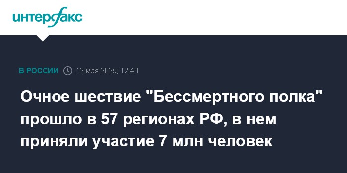 Москва. 12 мая. INTERFAX.RU - Шествие "Бессмертного полка" 9 мая в очном формате прошло в 57 регионах России; в нем приняли участие 7 млн человек, сообщила сопредседатель Центрального штаба ООД "Бессмертный полк России", первый зампредседателя Комитета Госдумы по труду, социальной политике и делам ветеранов Елена Цунаева.